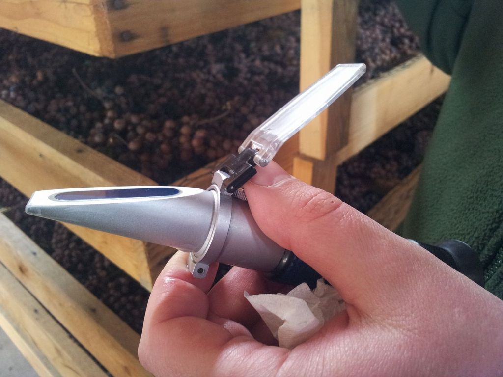 Postupně procházíme mezi rohožemi a Olda mi dává ochutnávat různě seschlé bobule. Nejméně cukernatá z těch, jejichž šťávu podrobujeme rozboru na refraktometru (na přístroj kápnete šťávu, sklíčkem ji přimáčknete a hodnotu odečtete pohledem proti světlu), ukazuje 27 stupňů. Naopak některé další jsou už spíše rozinkami: velmi scvrklé a mají výraznou chuť sušeného ovoce. U nich už refraktometr konkrétní hodnotu neukáže, měří totiž pouze do ekvivalentu 32 stupňů českého normovaného moštoměru. Sklepmistr mě pobídne také k ochutnání bobule napadené bílou penicilinovou hnilobou. Její chuť je zemitá, skoro, jako byste spadli obličejem do hlíny (vzpomínka na dětství s fotbalem, však to známe všichni, ne? 🙂 ). Ale nebojte se, tekutá antibiotika si kupovat nebudete (i když možná by je někdo uvítal): před lisováním se tyto bobule samozřejmě přeberou a vyhodí. Před zamýšlenou další fází výroby slámovky sklepmistr všechny rohože projde a náhodně vybere 100 až 200 bobulí, ze kterých udělají pár kapek moštu, aby zjistili, zda je již průměrná cukernatost taková, jakou by chtěli mít. Také vás napadá, jak ověří na refraktometru těch 38 až 40 stupňů, když přístroj ukazuje jen do 32?